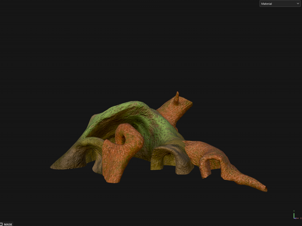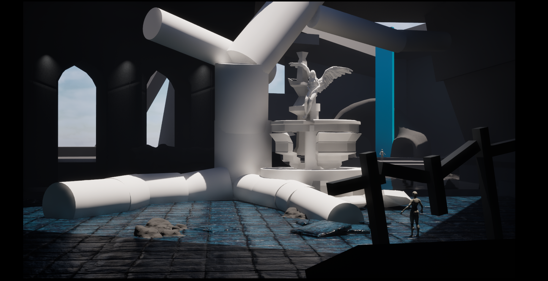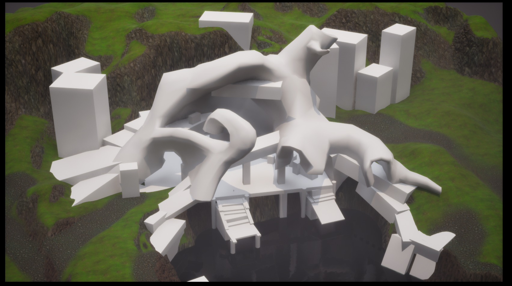 After multiple tweaks of the terrain I found out I'm stuck with having scarce ideas how to fill in the large-scale environment. So mid-October I switched over to building rather the enterior of a cavern: