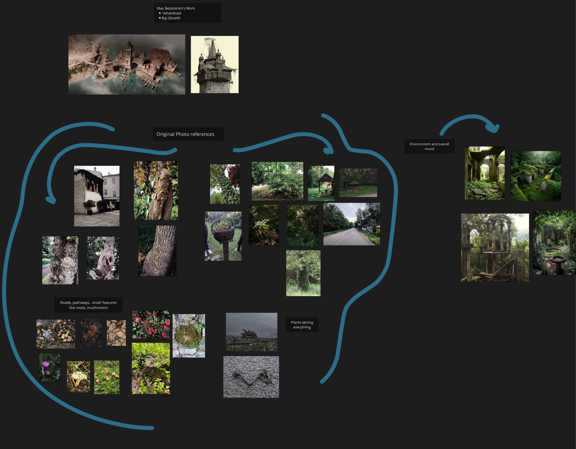 Namely, I got very inspired by the transformation and development of spring greenery in my local area, along with whimsical and mysteious visuals of various works by Max Bedulenko, most of which are included in his Velvet Road and Baj-Queeth series:
